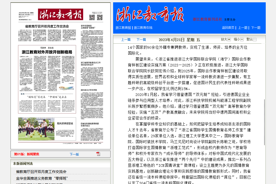 展望未来,《浙江省推进浙江大学国际联合学院(海宁)国际合作教育样板区建设实施方案(2023—2025)》正在积极推进。浙江大学国际联合学院院长欧阳宏伟介绍,到2025年,国际合作教育样板区建设将取得实质性进展,世界名校和全球科学家等一流科教资源进一步集聚,有主题科研的高能级科创平台进一步搭建,促进国计民生的代表性科研成果进一步产出,在校留学生比例达到15%。