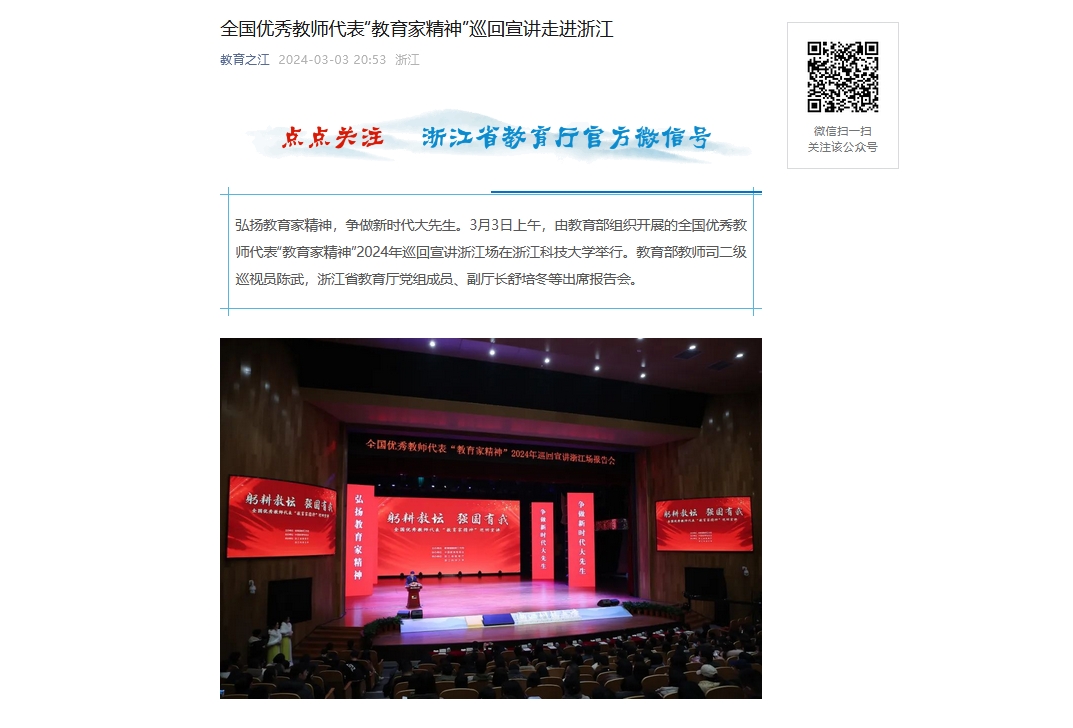 本次浙江场巡回宣讲采用“线上+线下”的形式举行,千余名在杭大中小学教师代表和师范生代表在现场聆听报告,通过网络直播观看人数超110万,直播平台点赞数超76万。