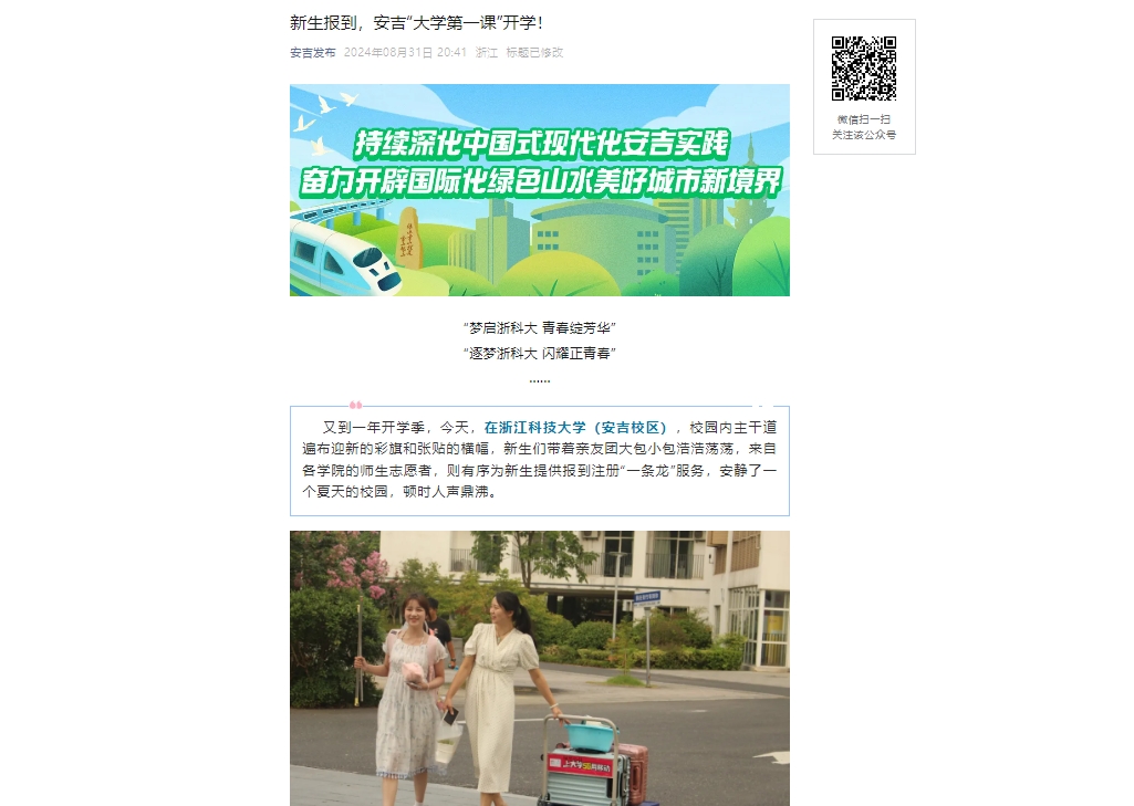安吉发布、爱安吉客户端报道我校2024级新生报到