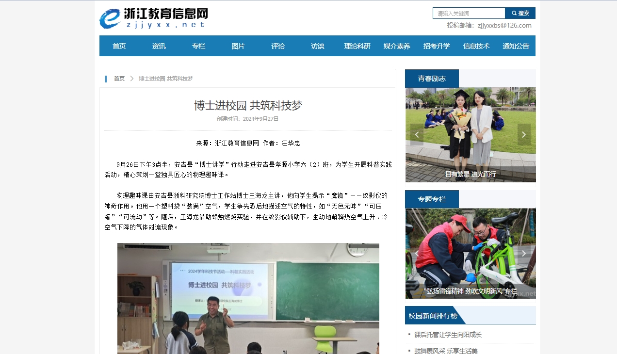 9月26日下午3点半,安吉县“博士讲学”行动走进安吉县孝源小学六(2)班,为学生开展科普实践活动,精心策划一堂独具匠心的物理趣味课。
