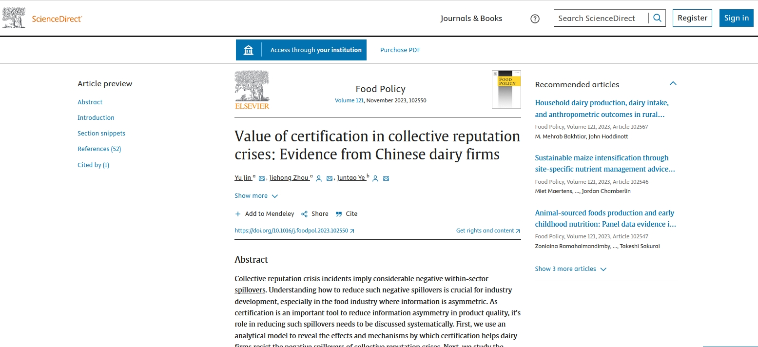 近日,经管学院应用经济学团队研究成果“Value of certification in collective reputation crises: Evidence from Chinese dairy firms”(点击阅读)在国际权威期刊《Food Policy》(中国科学院一区,Top期刊)上发表,该研究成果由我校应用经济学团队和浙江大学周洁红教授团队合作完成,叶俊焘教授为共同通讯作者。